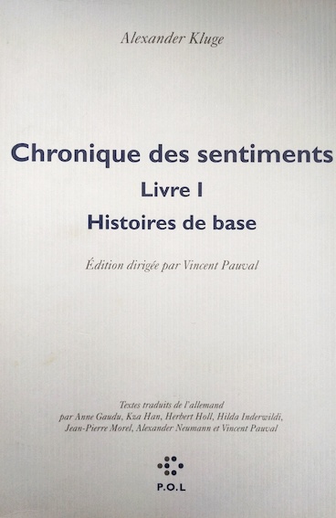 Alexander Kluge, Chronique des sentiments, livre I, histoire de base, Paris, P.O.L, 2016.