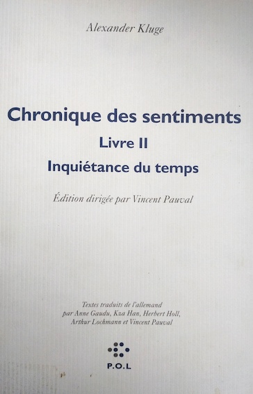 Alexander Kluge, Chronique des sentiments, livre II, Inquiétance du temps, Paris, P.O.L, 2018.