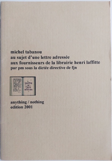TABANOU, Michel, au sujet d’une lettre adressée aux fournisseurs de la librairie Henri Laffitte par pm sous la dictée directive de fin, anything/nothing edition, 2001.