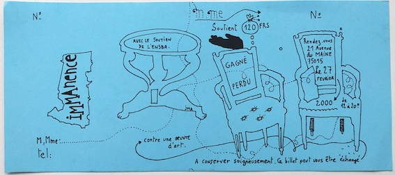 Jean-Michel Alberola, billet de tombola, Immanence, Paris, 2000, impression sur papier bleu, 8 x 20,8 cm.