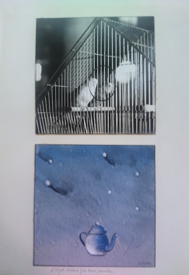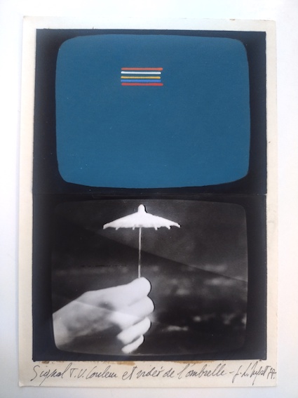 NYST, Jacques-Louis, Sigla TV couleur et under de l’ombrelle, gouache sur photographie, 143,5 x 20 cm. in L’ombrelle en papier et le principe de non-réalité, Yellow Now, 1976.