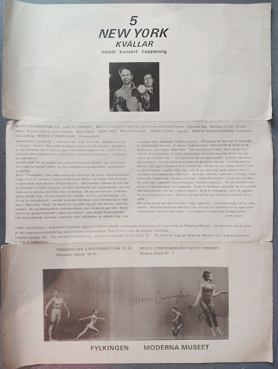 CAGE, John, CUNNINGHAM, Merce et RAUSCHENBERG, Robert, 5 NEW YORK Kvällar, balett konsert happening, Affiche pour Five New York Kvällar: (Five New York Evenings) Fylkingen, Moderna Museet, 1964, Offset sur papier 35 x 47 cm Signé par Merce Cunningham et John Cage.