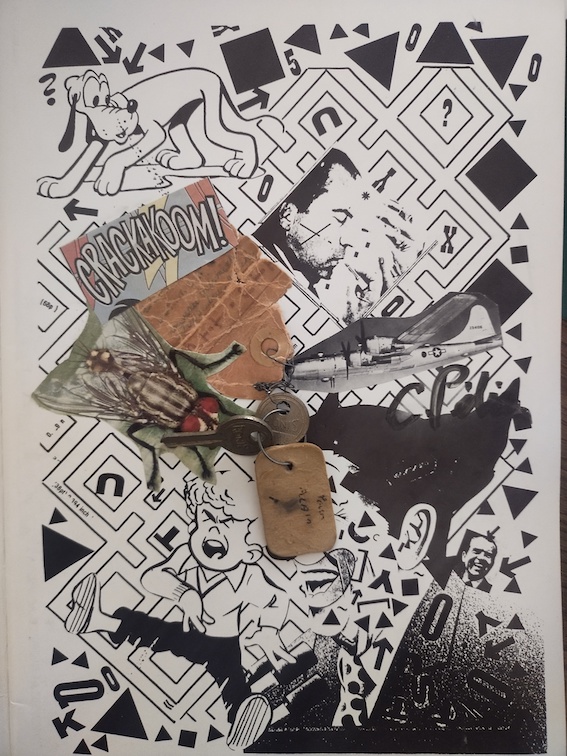 PÉLIEU, Claude, Crackakoom !, Feutre et collage sur papier Intervention de l’artiste dans la publication «Bonjour M’sieu Orwell». 21 x 29,7 cm, 1983, signé.