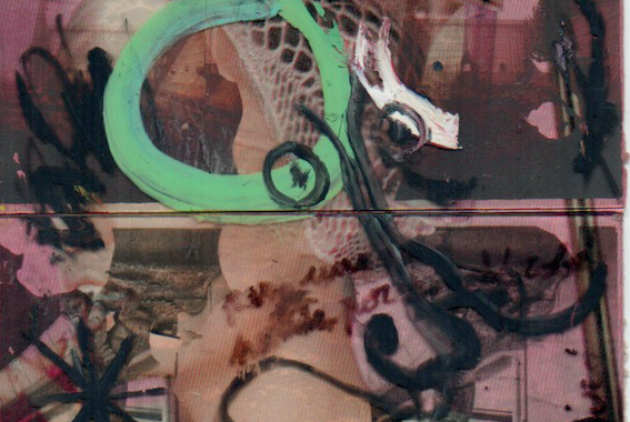 PRÉVERT, Jacques, et MIRO, Joan, Sans titre, 9 x 10,5 cm. Signé par les deux artistes. Collage photographique sur papier sur lequel est collé deux lamelles de verres peintes et signées par les deux artistes.