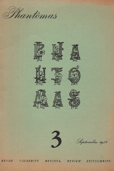 Phantomas N°6, (Noiret, Joseph, Koenig, Théodore, Havrenne, Marcel, dir.), Bruxelles, 1956. Textes de von Hofmannsthal, J. Arp, J. Lacomblez, Ch. Dotremont, Hui-Tsu, A. Fell.