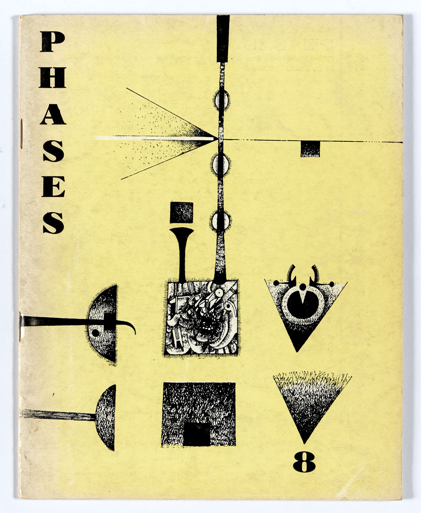 Phases N°8, Cahiers internationaux de documentation sur la poésie et l’art d’avant-garde, Paris, janvier 1963. Edouard Jaguer (ed.). Couverture de Lacomblez. Avec deux lithographies originales en couleur de Julio H. Silva et Corneille, et une belle xylographie sur double page de Makowski, imprimé sur papier écru et fort. Textes de Brunius, Tarnaud, Jaguer, Klapheck, Schuster, Mayoux, Pierre, Legrand, Cabanel, Dhainaut, Alechinsky, Ivsic, Benayoun, Goldfayne. Illustrations de Gotz, Alechinsky, Buchheister, Heisler, Granell, Biasi, Oelze, Baj, Gironella, Rosenquist, Freddie, Fahlstrom, Pezzo, Dax, Lagarde.