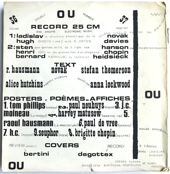 CHOPIN, Henri, Revue OU N°26/27, The Gate House, Ingatestone, Essex, 1966. Contient un disque 17cm (Raoul Hausmann (lisant lui-même), accompagné d’un poème-partition, mécano poème et biopsie de Heidsieck etChopin et deux autres audiopoems de Chopin). Contient un texte de Chopin de 50 pages à 20 artistes et a publié leurs réponses. contributions de : Edmund Alleyn, Roberto Altmann, Serge Béguier, Bertini, Jan Burka, John Furnival, Ilse et Pierre Garnier, Hirsal, Grögerova, Jiri Kolar, Kosice, Hansjörg Mayer, Rancillac, Carl Frederick Reuterswärd, Rotella et Ben. Affiche de Roberto Altmann couverture de Burka.