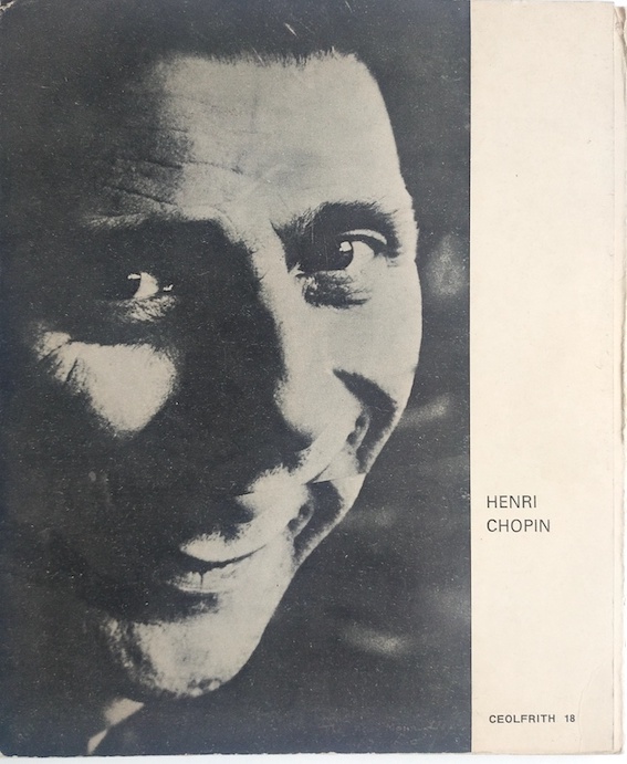 CHOPIN, Henri, Ceolfrith 18, 1972. Fascicule agrafé, couverture illustrée, 230 x 190 mm, non paginé. Essai autobiographique d’Henri Chopin. Nombreuses illustrations en noir et couleurs. Fac-similé d’une lettre d’André Breton à Henri Chopin, et réponse de celui-ci en anglais. Contributions : Henri Chopin, Raoul Hausmann, Alicia Drweski, André Breton.
