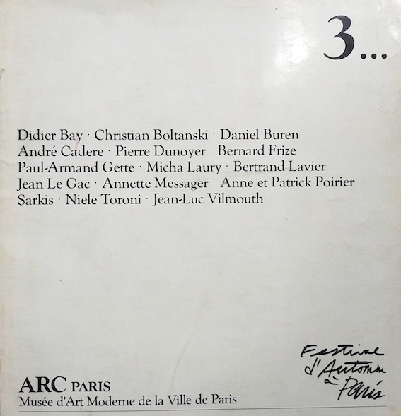 COLLECTIF, 3…, ARC, musée d’art moderne de la ville de Paris, festival d’automne, 1980. Didier Bay, Christian Boltanski, Daniel Buren, André Caderé, Pierre Dunoyer, Bernard Frise, Paul-Armand Gette, Micha Laury, Bertrand Lavier, Jean Le Gac, Annette Messager, Anne et Patrick Poirier, Sarkis, Niele Toroni, Jean-Luc Vilmouth.
