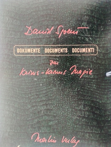 SPOERRI, Daniel, Dokumente / Documents / Documenti zu Krims Krams Magie, Hambourg Merlin Verlag 1971 27,8×20,6 cm, huit enveloppes reliées dans un portefeuille à ruban en simili cuir, titre en rouge or en couverture. Les enveloppes contiennent des contributions d’Emmett Williams, Daniel Spoerri, Pierre Alechinsky, Sybille Hentze.