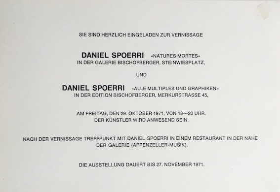 SPOERRI, Daniel, carton d’invitation pour l’exposition Natures mortes, galerie Bruno Bischofberger, Zürich, 1971.