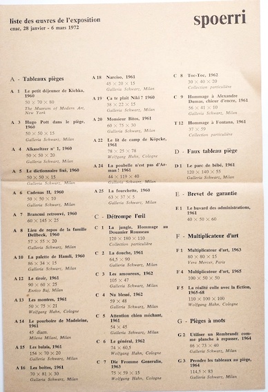 SPOERRI, Daniel, liste des œuvres exposées au CNAC, 1972.