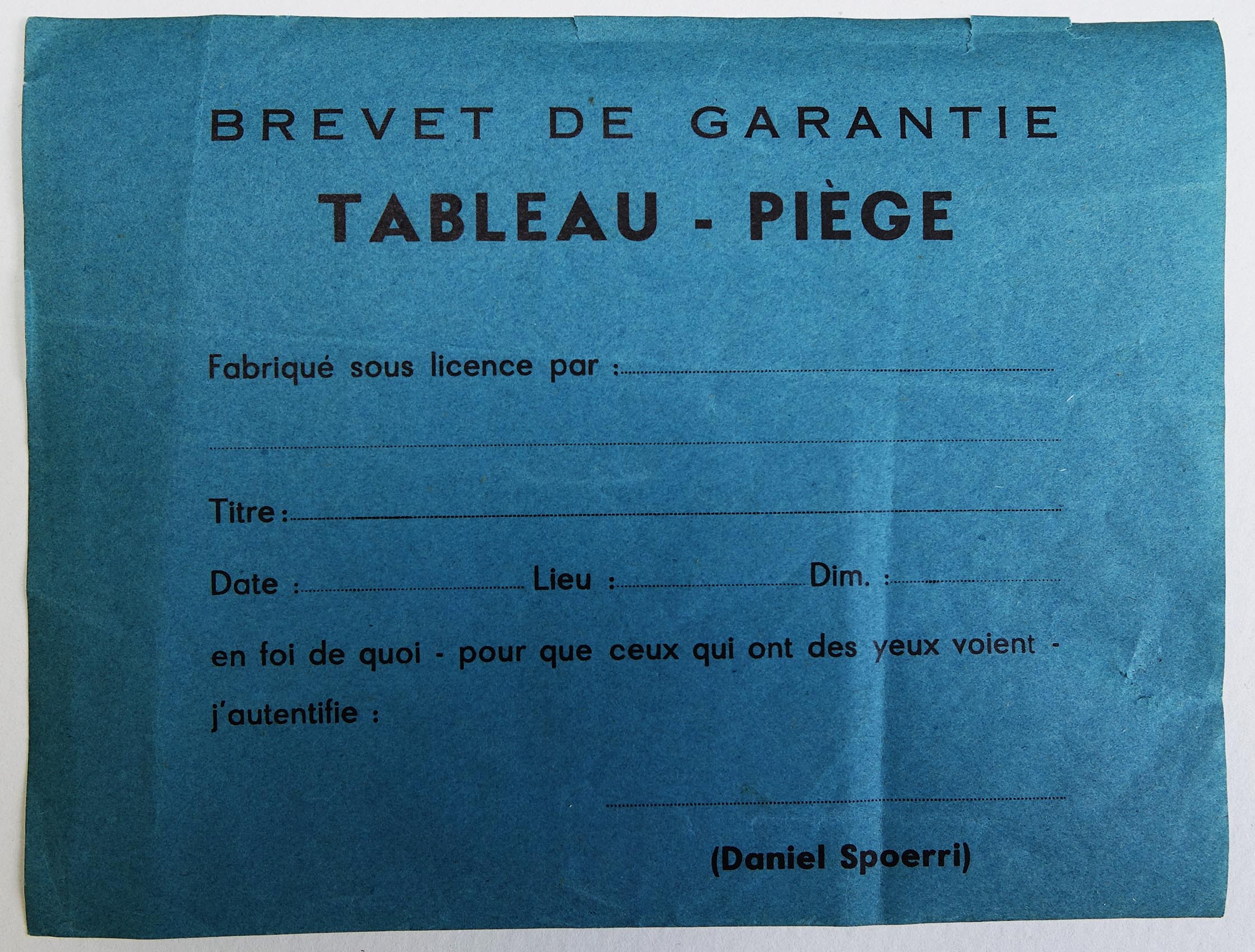 SPOERRI, Daniel, Brevet de tableau piège vierge.
