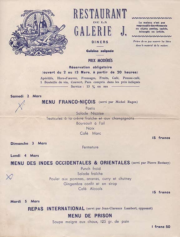 SPOERRI, Daniel, Menu, restaurant de la galerie J, 1963.