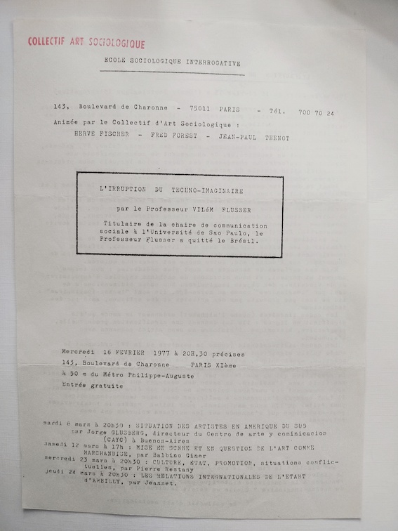 Art Sociologique, Flusser, Vilem, L’Irruption du techno-Imaginaire, Ecole Sociologique Interrogative, Paris, 8 pages, iml. sur papier blanc.