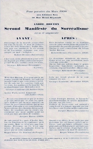 Tract pour la parution de André Breton, du Second Manifeste du Surréalisme, Paris, Kra, mars 1930, 15 x 24 cm.
