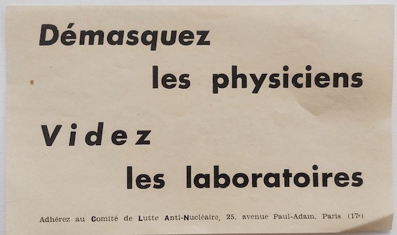 Démasquez les physiciens, videz les laboratoires, Paris, 18 février 1958, papillon, 13,5 x 8 cm.