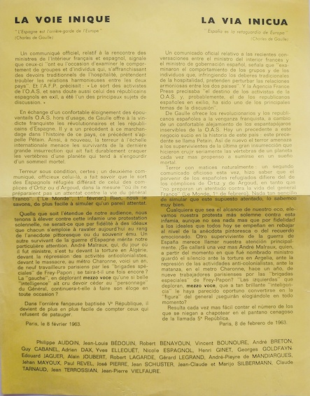 La voie Inique, La Via Inicua, Paris, 8 février 1963, iml. sur papier jaune, signé par Philippe Audoin, Jean-Louis Bédouin, Robert Benayoun, Vincent Bounoure, André Breton, Guy Cabanel, Adrien Dax, Yves Elleouët, Nicole Espagnol, Henri Ginet, Georges Goldfaye, Edouard Jaguer, Alain Joubert, Robert Lagarde, Gérard Legrand, André-Pierre de Mandiargues, Jean Mayoux, Paul Revel, José Pierre, Jean Schuster, Jean-Claude et Marijo Silbermann, Claude Arnaud, Jean Terrossian, Jean-Pierre Vielfaure.